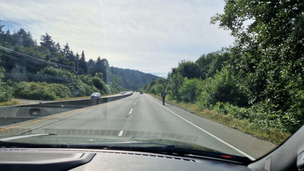 In Canada wird die Strasse geteilt, share the Road. Die Strecke hat zwar zwei Spuren, war aber nur 90 km/h, also wie bei uns Überlandstrassen. Dennoch seltsam, wenn da ein Kickifahrer auf der Strasse unterwegs ist.