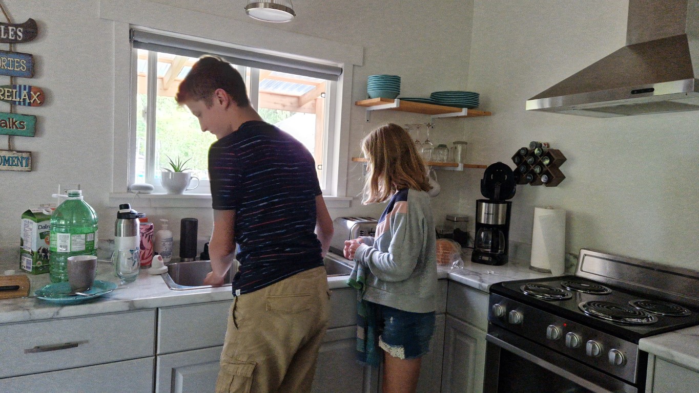 Dieses Haus hat keine Abwaschmaschine, da kam doch gleich ein bisschen Lagerfeeling auf. Es wurde gerecht aufgeteilt. Zwei arbeiten einer lungert herum, schön im Wechsel.